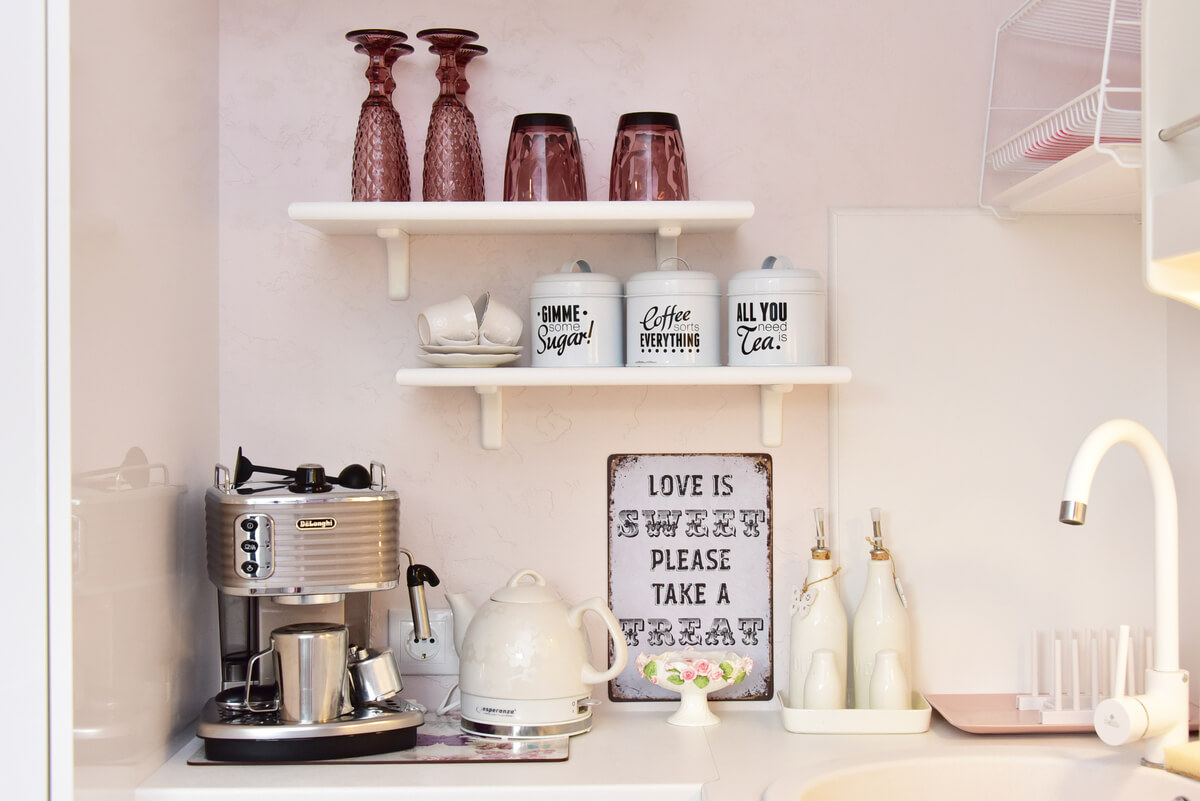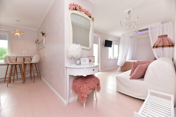 Romantisks dzīvokļa iekārtojums balti-rozā toņos ar daudziem dekora elementiem. Vairāki apgaismojuma scenāriji. No balkona paveras skats uz jūru. Virtuvē ir viss nepieciešamais ēdiena pagatavošanai. Garšīga kafija un ūdens pudele bezmaksas. Diezgan tīrs dzīvoklis. Spogulis virs gultas. Bezkontakta reģistrēšanās. Suņiem draudzīga vieta.